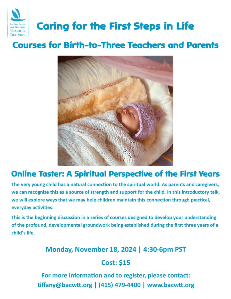 The very young child has a natural connection to the spiritual world. As parents and caregivers, we can recognize this as a source of strength and support for the child. In this introductory talk, we will explore ways that we may help children maintain this connection through practical, everyday activities.