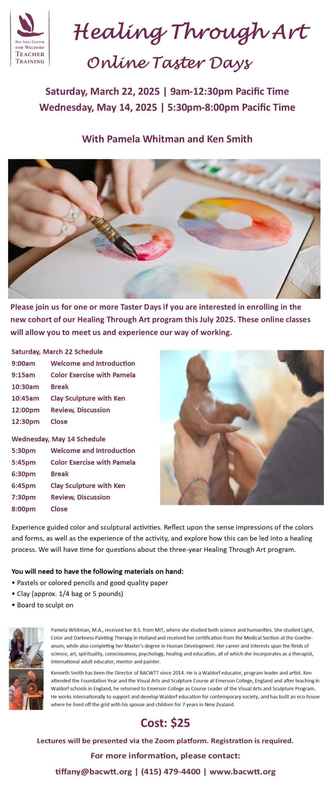 Experience guided color and sculptural activities. Reflect upon the sense impressions of the colors and forms, as well as the experience of the activity, and explore how this can be led into a healing process. We will have time for questions about the three-year Healing Through Art program.