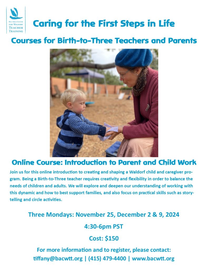 Join us for this online introduction to creating and shaping a Waldorf child and caregiver program. Being a Birth-to-Three teacher requires creativity and flexibility in order to balance the needs of children and adults. We will explore and deepen our understanding of working with this dynamic and how to best support families, and also focus on practical skills such as storytelling and circle activities.