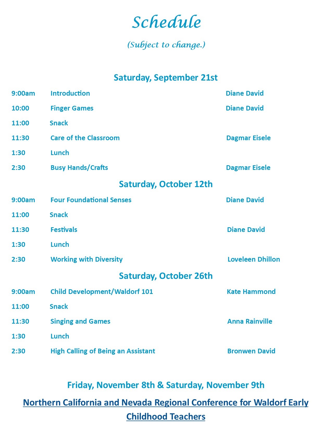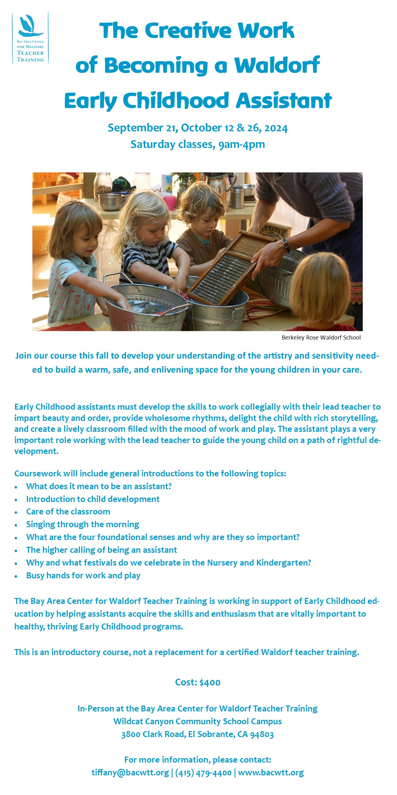 Early Childhood assistants must develop the skills to work collegially with their lead teacher to impart beauty and order, provide wholesome rhythms, delight the child with rich storytelling, and create a lively classroom filled with the mood of work and play. The assistant plays a very important role working with the lead teacher to guide the young child on a path of rightful development.