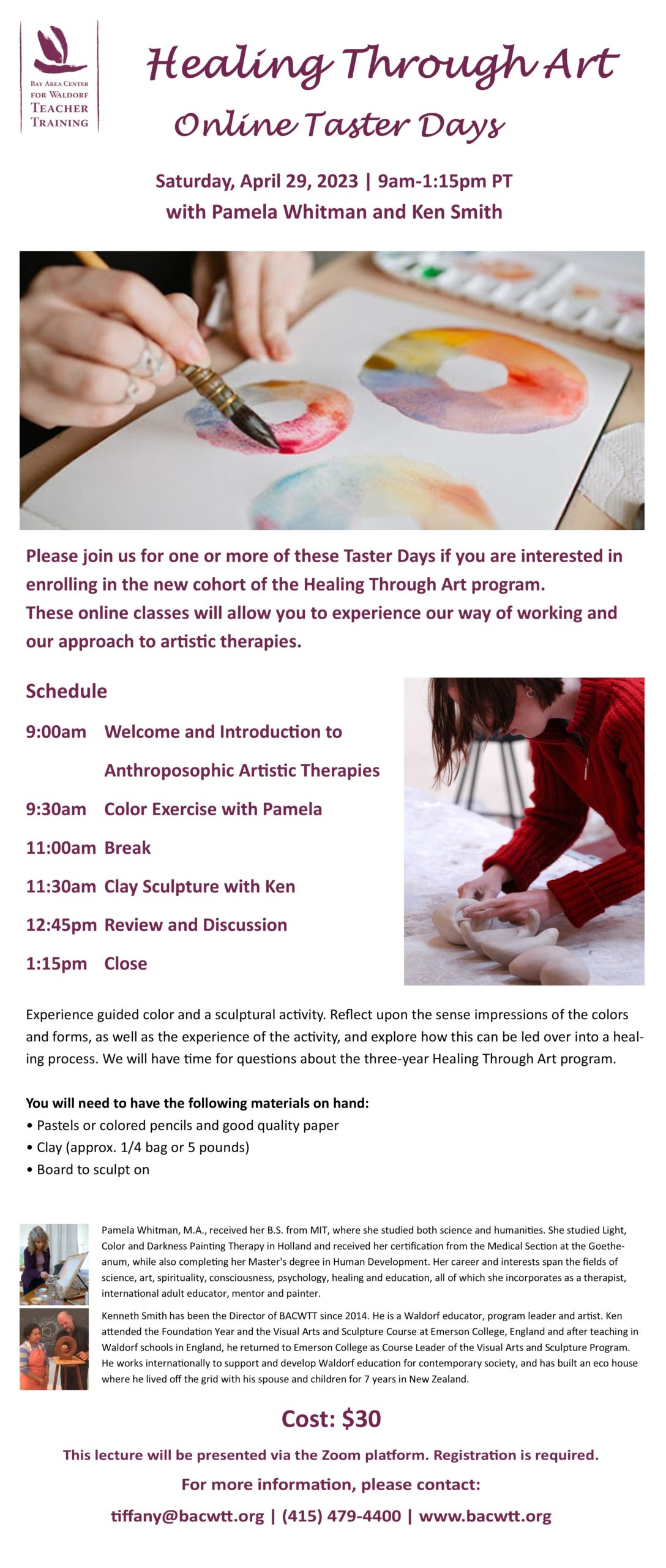 Ken  Smith is the Director of BACWTT. He studied at Emerson College, England, and completed his training in sculpture and the visual arts with practices in pedagogical and therapeutic work. After working in Waldorf education, he taught  as Course Leader of the 3-year Visual Arts and Sculpture Training program at Emerson  College. He has been active internationally in Anthroposophical art and Waldorf education for over 25 years.