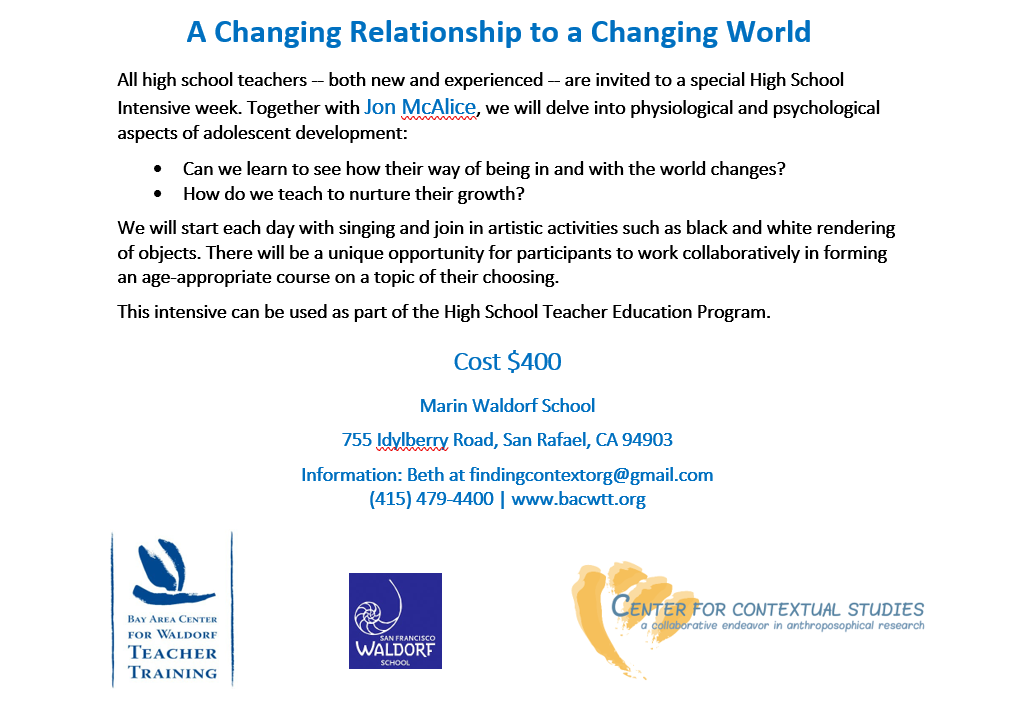 We are very happy to have Paolo Carini with us again this summer leading our upper grades week. Paolo has taught at the San Francisco Waldorf High School for 28 years and is a longstanding member of the BACWTT faculty. He will share his experiences of guiding young people into lifelong learning.