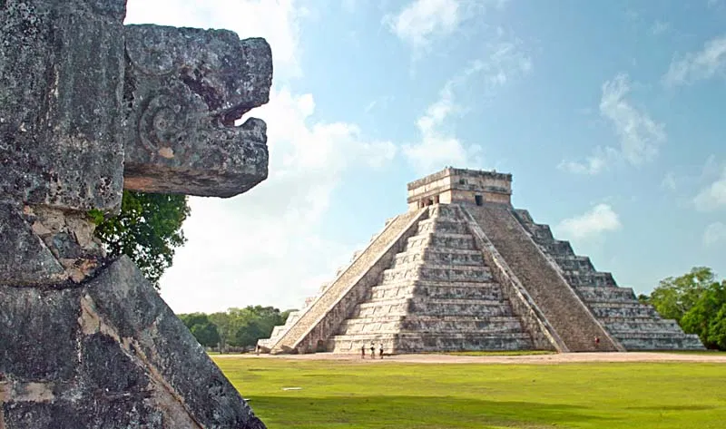 During the vernal and autumnal equinoxes at Chichén Itzá, the great Mayan city in Mexico’s Yucatán Peninsula, sunlight plays with the angles of the northeast stairway of the Kukulcán pyramid as it moves from east to west. The course of the sun projects the shadows of the corners of the pyramid onto the vertical, northeast face of the stairway balustrade, giving the visual impression that the body of an undulating serpent is slowly working its way down toward its stone head at the bottom, coming down from the sky to the earth.