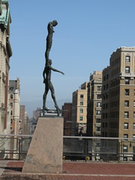Kees Verkade represented Bill Donovan as a tightrope walker with someone balancing on his shoulders. He tried to capture the feeling that if the tightrope walker made a wrong decision, everything could collapse. Kees considered that the sculpture depicts the balance of law.